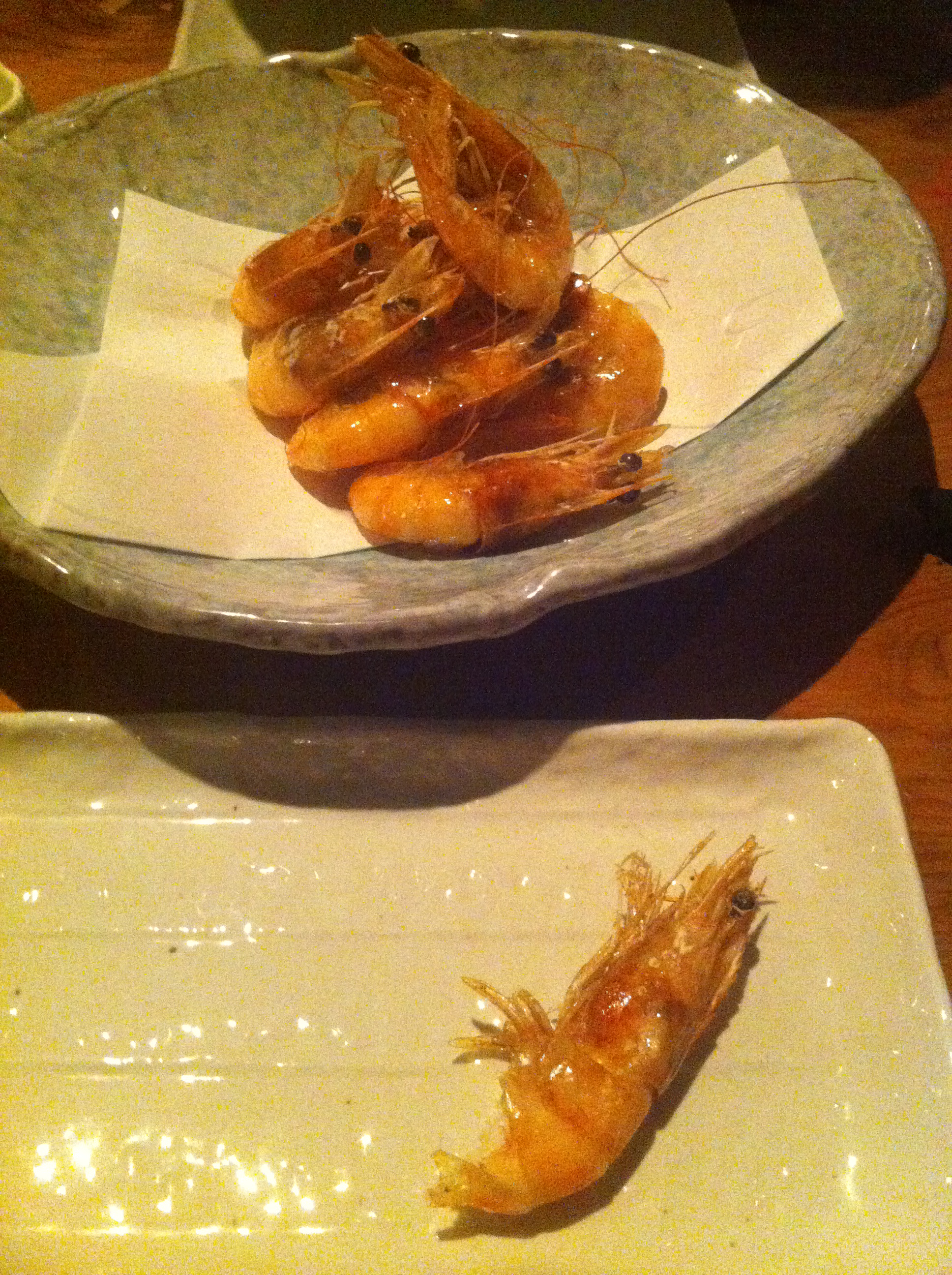 Corey and I ordered crispy fried shrimp, agedashi tofu, and a sunomono salad to start. The menu didn’t have descriptions of the items, so I imagined the crispy fried shrimp would be similar to shrimp tempura—shrimp that have been battered and deep-fried. Instead, the waitress delivers these: