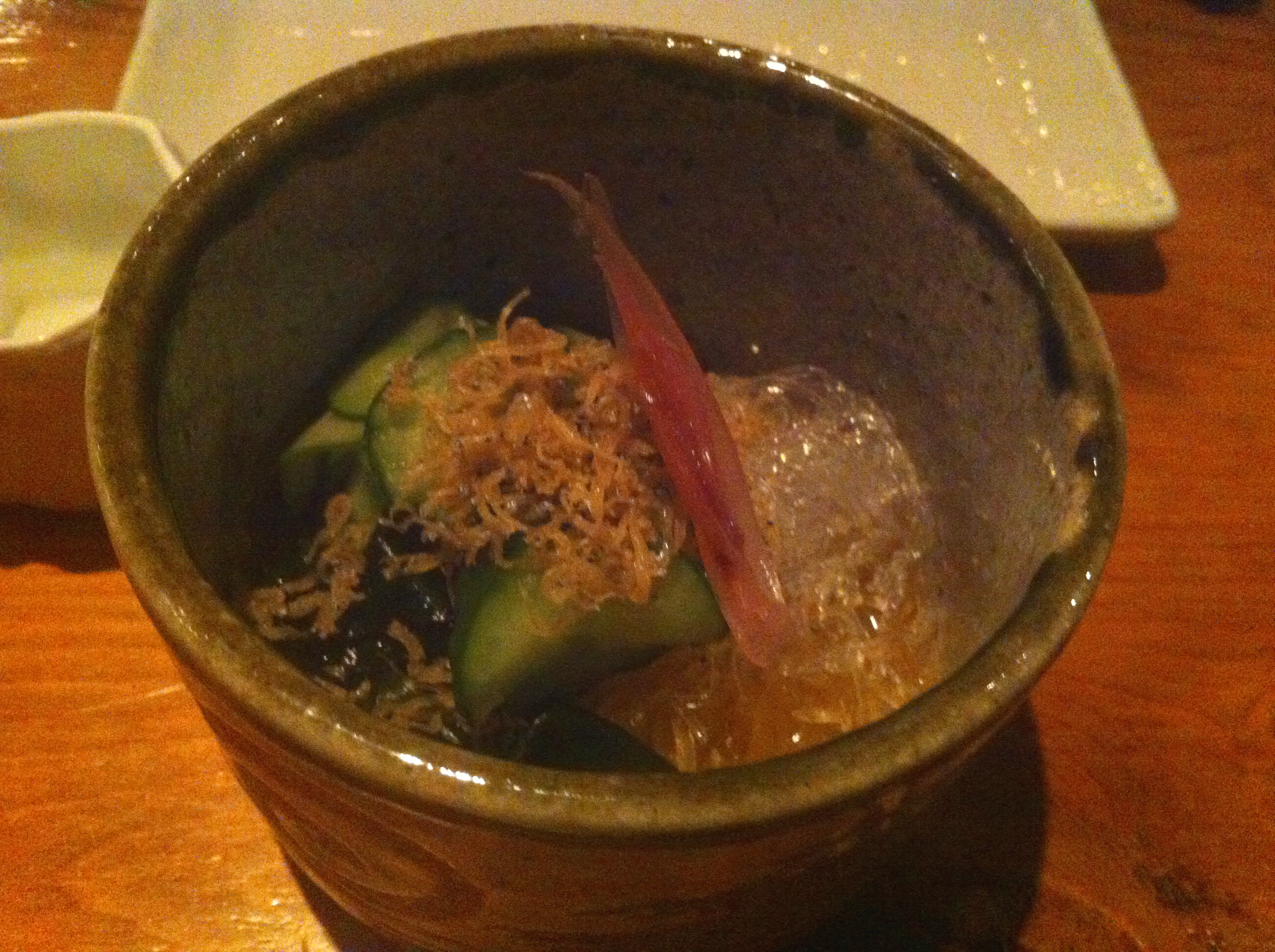 Our next course was sunomono salad—a vinegary cucumber-and-seaweed salad with glass noodles (also known as cellophane noodles). The Japanese cucumbers were thinly sliced and marinated in rice vinegar, producing a tangy-sweet salad that was quite refreshing.